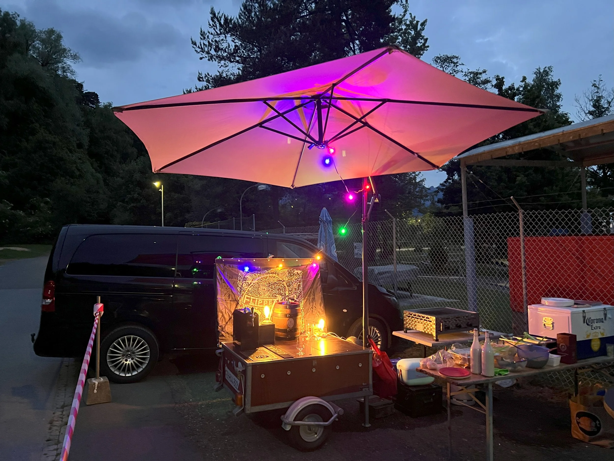 Ca. 40 Gläser sind im Anhänger enthalten, leicht erreichbar durch eine praktische Klappe Stimmungsvolle Beleuchtung & ein bedruckter Ampelsonnenschirm für die perfekte Atmosphäre Leicht und unkompliziert: Der Anhänger kann ohne Anhängerprüfung gefahren werden und wiegt nur ca. 190 kg!